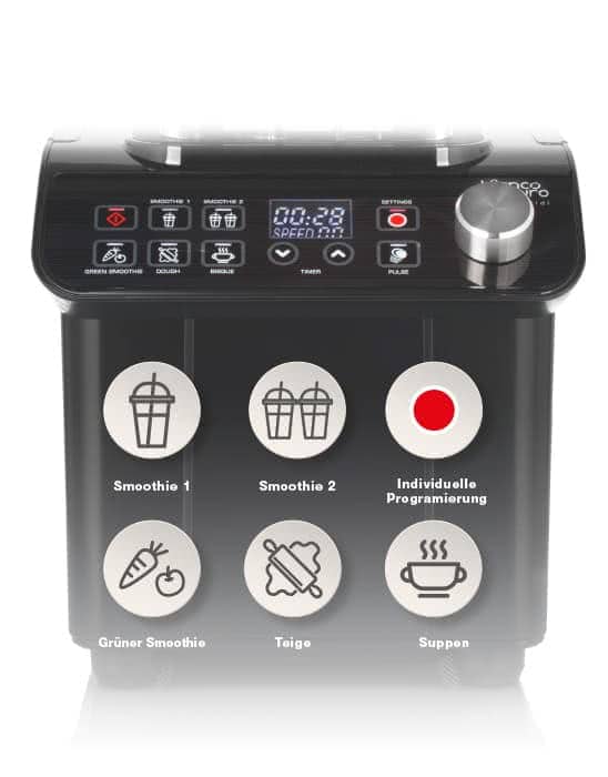 Der Bianco Gusto Pro setzt den Fokus auf individualisierte Zeitprogramme. Er bietet 5 voreingestellte Programme an und die Option weitere 5 Programme selber zu definieren. Das kann vor allem für Gastro-Profis sehr interessant sein, die ein Zeitprogramm auf eine bestimmte Zubereitungsmenge optimieren möchten. Außerdem ist der Gusto Pro im Gegensatz zum Gusto kompatibel mit dem Bianco Soundcover. Diese Schallschutzhaube reduziert den Geräuschpegel während des Mixens.